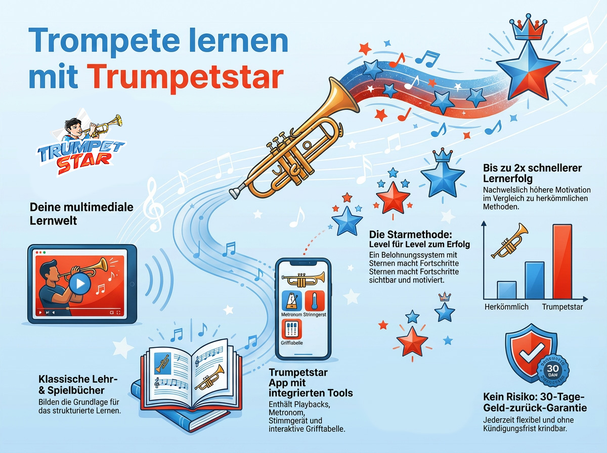 Worauf wartest du noch? Lerne Trompete auf eine völlig neue Art und Weise und maximiere deinen Lernerfolg mit Trumpetstar!